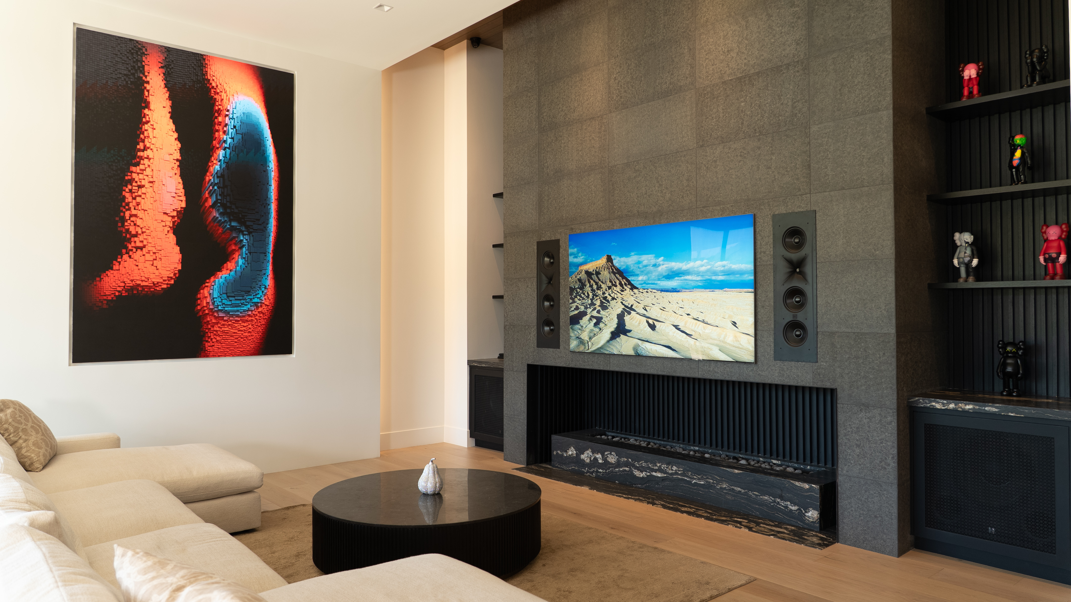 The cinema room is built around a Triad Platinum Theater system, one of the highest-performance cinema solutions, supported by detailed acoustic treatment and careful calibration. Media Innovation Technologies has a similar Platinum Theater in its dedicated Scottsdale office showroom, and Viktor duplicated it in his home for one reason: it sells itself. “When you hear a Triad system dialed in properly, there’s nothing else like it,” he said. “It immediately shows clients what’s possible when everything is engineered together.” Large-format video extends into the rest of the home with an almost 9-foot-tall portrait orientation digital art display, with Control4 driving a curated rotation of content. Outdoors, a 17-foot-wide, weather-ready LED video wall serves as an open-air theater — one of the most talked-about features during client walkthroughs.